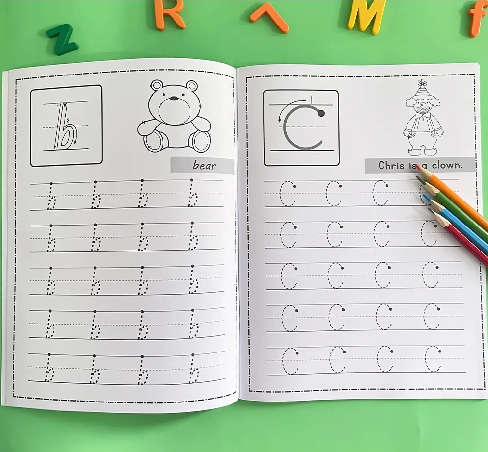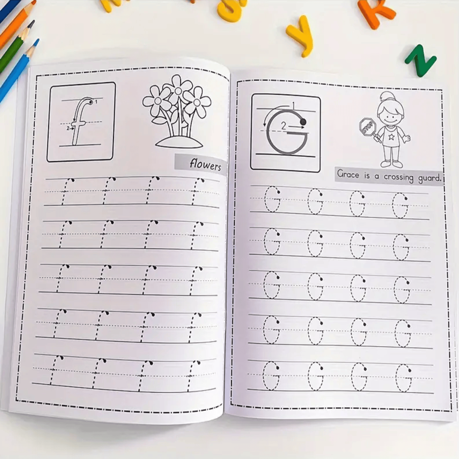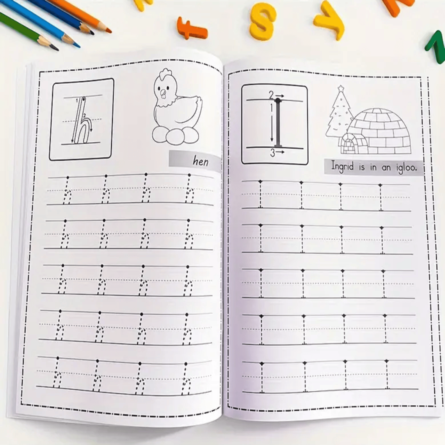 Istruzioni chiare ed esempi guidano i bambini su come formare correttamente ciascuna lettera dell’alfabeto.