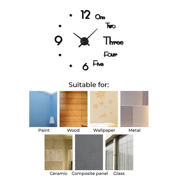 Istruzioni e accessori per l’installazione semplice incluso nella confezione. Usa chiodi e martello per attaccare il gancio alla parete e poi attaccaci l’orologio. Contrassegna il diametro desiderato del quadrante, rimuove il foglio protettivo dai numeri e attaccare sulla parete. Attacca le lancette al meccanismo e l’orologio da parete autoadesivo è pronto.