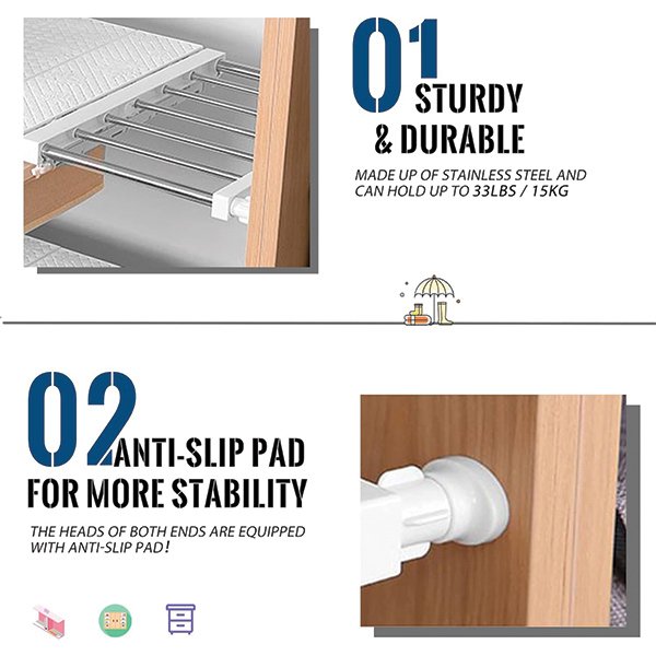 Installare Shelfy è un gioco da ragazzi – basta regolare le aste a tensione per adattarle alle dimensioni del tuo armadio, e sei pronto. Nessun attrezzo o assemblaggio richiesto.