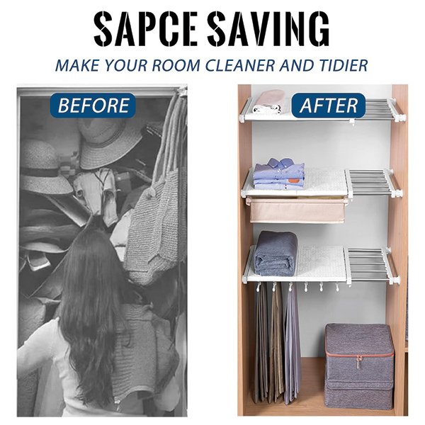 Organizzati con Shelfy, il ripiano espandibile a tensione che aggiunge istantaneamente spazio di archiviazione aggiuntivo al tuo armadio senza bisogno di attrezzi o installazione.