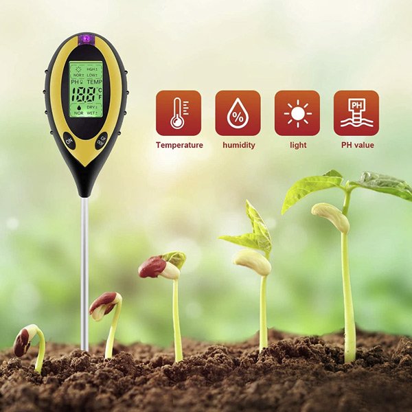 Vi presentiamo il nostro misuratore di terreno 4 in 1. Le sue funzioni sono molto varie: può misurare l’umidità del suolo, la temperatura, il pH del suolo e l’intensità della luce solare. È lo strumento migliore per monitorare la salute e la crescita delle piante.